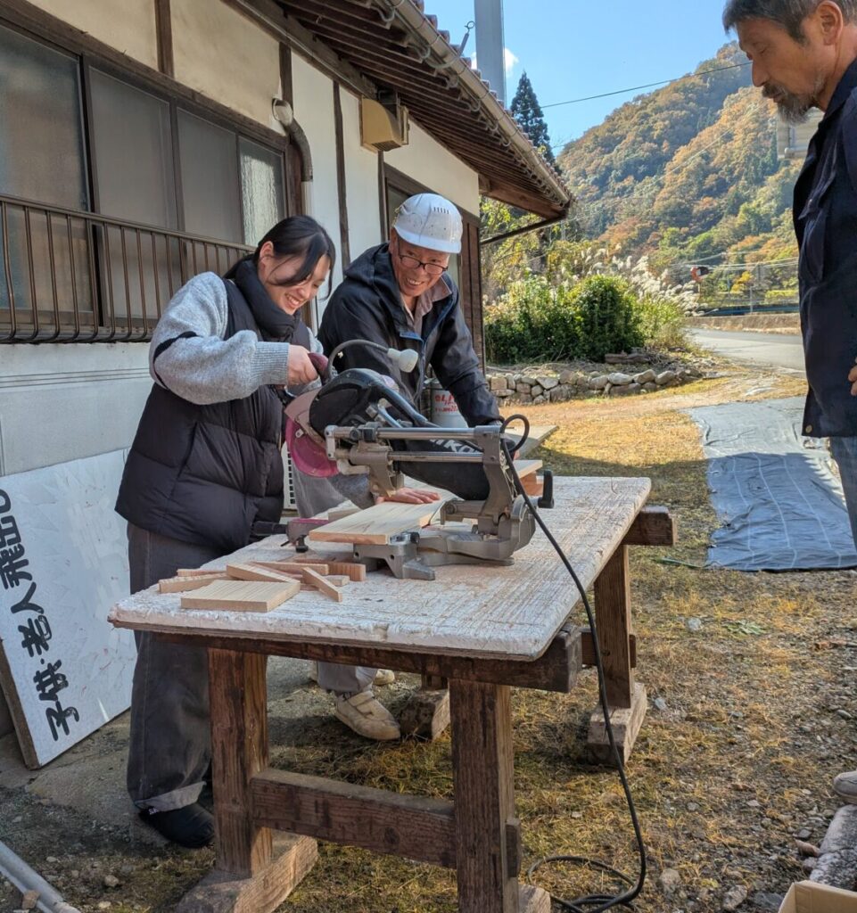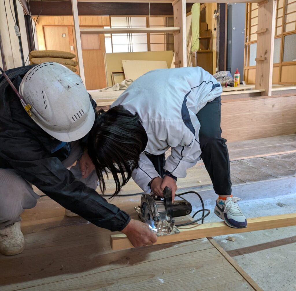 上の2枚の写真は参加した学生さんが、大工さんの指導のもと材料の加工に挑戦している様子です。どの工具もプロ仕様の物であるため、少しの力加減で曲がったり、直ぐに切れたりと初めての体験に大満足のようでした。