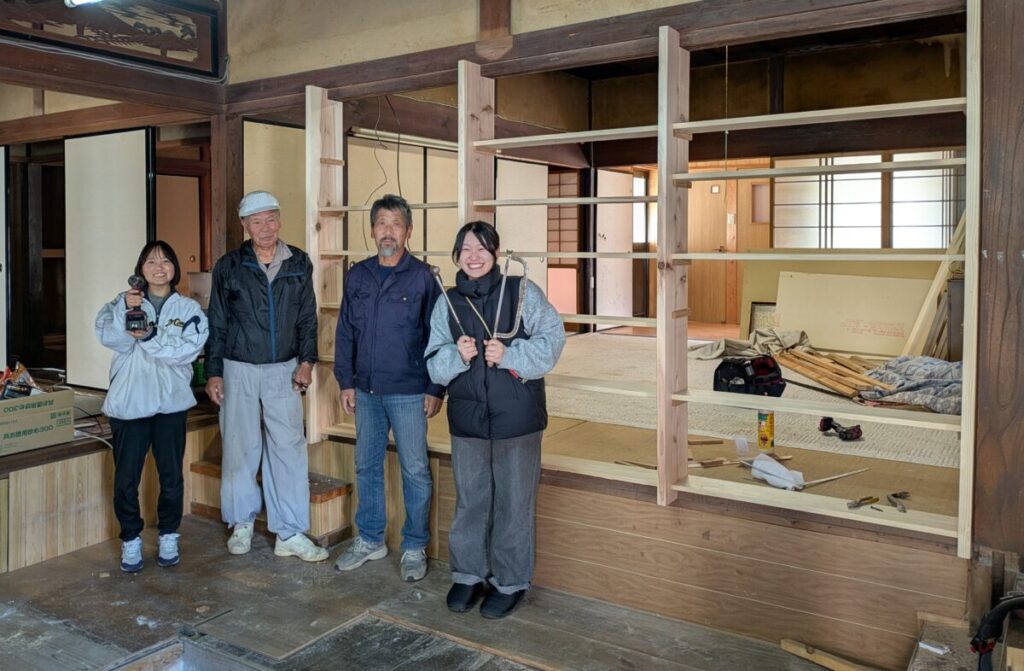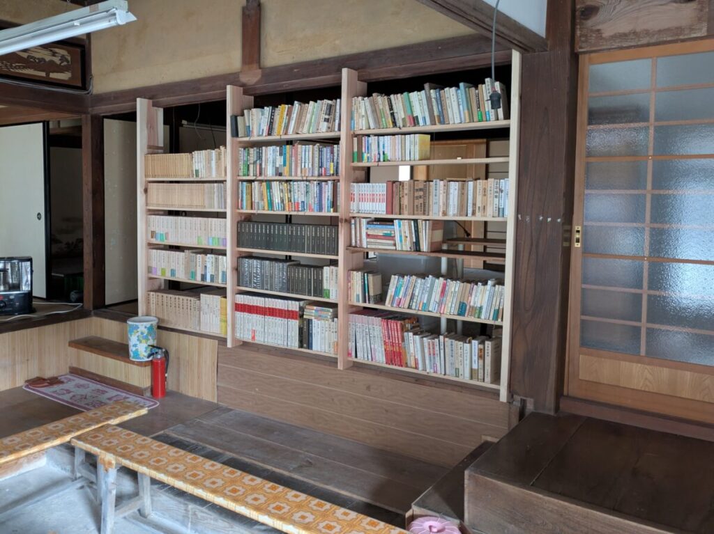 今回は、2名の学生さんと地元の大工さんと有志の方と私の5名で秘密基地のdiyに挑戦しました。作業は元々の壁一面を取り除き、空いたスペースを全面本棚に作り変えることです。