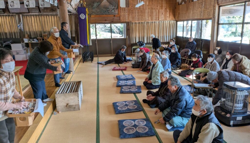 中山間の限界集落ですが、冬場の数少ない行事でもありますので、当日はそこそこの参拝者がおられました。